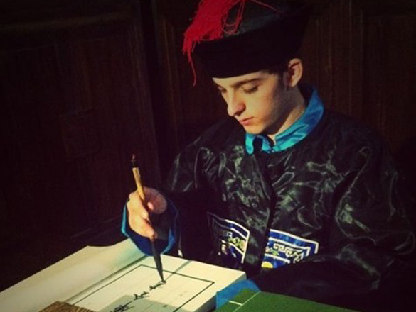 说起对汉字的兴趣,大卫称,是源于儿时的玩具枪,枪上写着“made in China”并用汉字标注了“安全须知”,当时他觉得这些“中国符号”真是太漂亮了。13岁那年,他又意外地看到了一大段中国象形文字,一下子被吸引了,买来光盘开始自学,从此一发不可收拾。 中学毕业后大卫就高分通过汉语初级水平考试,并进入俄罗斯一所大学的中文系学习。但他总觉得这样的学习缺少点什么,为了学习地道的汉语,大卫选择了退学,随后考取了“北京市外国留学生奖学金”,进入北京语言大学学习。 作为留学生,他先是进了汉语学院(为外国人提供中文培训),可仅仅一个学期之后,“听说读写”已经远远满足不了他对中国文学、中国文化的渴望,他毅然转入人文学院,与中文系的中国同学一起上《中国古代文学》、《当代文学》课程,一起研究“汉语言文学”。