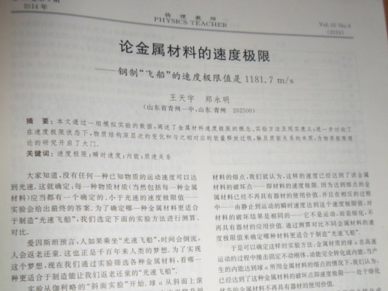 《物理教师》是一本致力于促进中学物理教学理论与实践问题研究的刊物,这次的突破,也让郑永明随后的论文写作路顺了不少,论文《焦耳实验的疏漏》发表在2014年《物理通报》增刊上;《相对论中质素关系的适用范围》发表在2014年《中学物理教学参考》8期下月刊;文章《给我速度,我能点燃大海》被录用于《中学物理教学参考》11期下;《试论物质的温度极限》被录用于《湖南中学物理》11期。记者曾就郑永明的论文专门咨询过一位物理学博士,虽然他认为其中有些观点可以商榷,但他很诚恳地表示,如果是初中毕业能写出这些确实不容易。