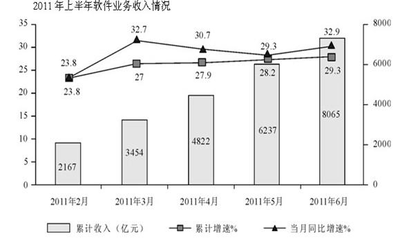 2011年上半年,我国软件产业实现软件业务收入8065亿元,同比增长29.3%,增速比去年同期高0.2年百分点;实现利润103亿元,同比增长34.9%。其中,6月份完成软件业务收入1828亿元,同比增长32.9%,增速比5月份回升3.6个百分点。