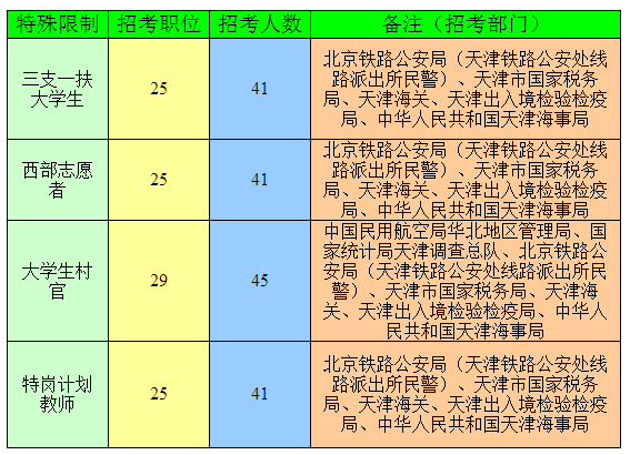 通过上面的三个图表我们可以得出,2015年天津国考招考职位总共224个,总招考人数为438人。从总体上看,对于报考职位有政治面貌限制的职位大约占到所有报考职位的12.5%{(11+17)÷224=12.5﹪},对于报考职位有工作经验限制的职位大约占到所有报考职位的17.4%{(35+4)÷224=17.4﹪},对于报考职位有特殊限制的职位大约占到所有报考职位的12.9%(29÷224≈12.9%)。因此,我们可以说,应届生且不是党员或者团员的,可以报考的职位至少要占到所有报考职位的57.2%(1-12.5%-17.4%-12.9=57.2%)。而对于应届生是党员或者团员的,则可以报考的这位至少要占到69.7%(1-17.4%-12.9%=69.7%)换句话说,国考对于我们应届生来说是一个很大的机会。