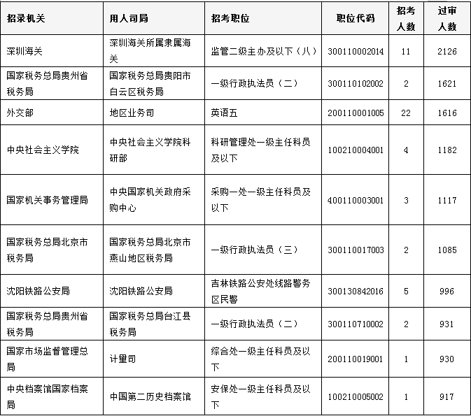 截至10月21日9时,报名人数突破一千人的职位有6个。“深圳海关所属隶属海关监管二级主办及以下(八)”一职已通过审核2126人,是唯一一个过审人数突破两千人大关的职位。 “国家税务总局贵阳市白云区税务局一级行政执法员(二)”与“外交部地区业务司英语五”这两个职位目前报名人数都已经超越了一千六百人,也远超其他职位的报名人数,最引人注意的是“国家税务总局贵阳市白云区税务局一级行政执法员(二)”这一职位仅招录2人。
