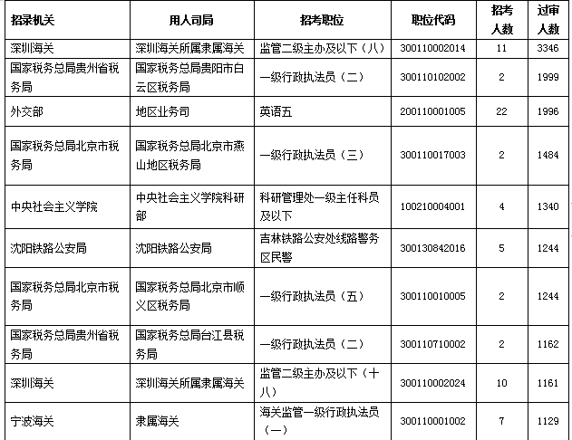 截至22日9时,突破千人报考的职位有20个,“深圳海关所属隶属海关监管二级主办及以下(八)”这一职位,以过审3346人的优势长期占据榜首之位,是唯一一个过审人数超越了三千人的职位;该职位招录11人,机遇较多,地处发达城市—深圳。“国家税务总局贵阳市白云区税务局一级行政执法员(二)”与“外交部地区业务司英语五”这两个职位目前过审人数已经非常接近两千人。