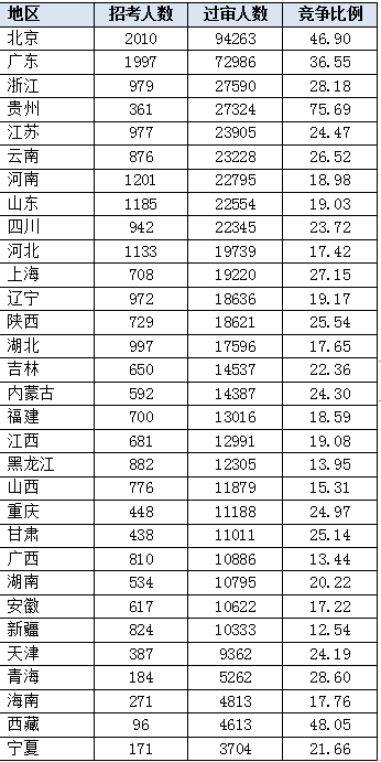 从各地报考情况来看,北京成为过审人数最多的地区,广东紧随其后,但竞争最激烈、考试难度最大的地区集中在贵州、西藏等西部省份,贵州考区平均竞争比高达75.69:1,西藏地区紧随其后,竞争比高达48.05:1,这两个地区的难考程度超越了北京。