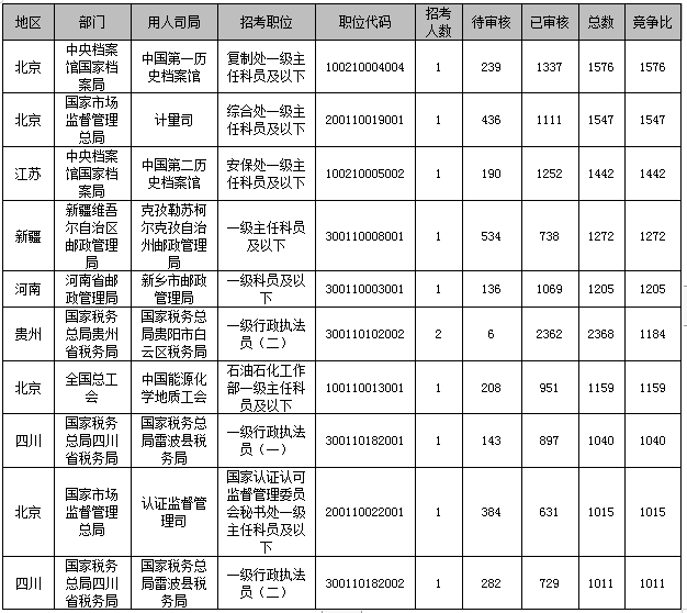 竞争最激烈十大岗位:竞争比最小值为1011:1