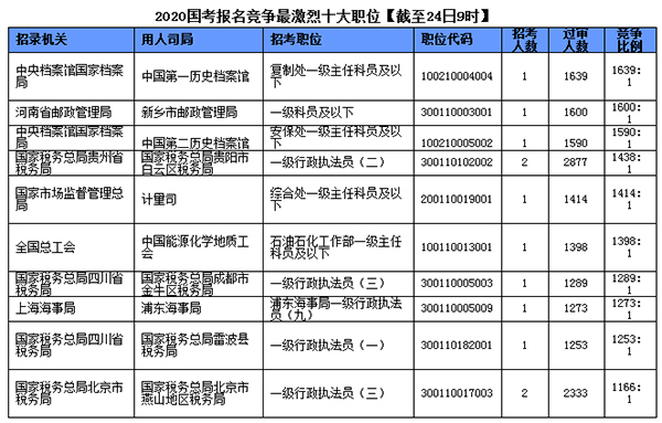 截至10月24日9时,已经有20个职位竞争比超越1000:1,位居榜首的依然是中国第一历史档案馆复制处一级主任科员及以下100210004004这一职位。河南省邮政管理局新乡市邮政管理局一级科员及以下300110003001 这一职位排名第二。