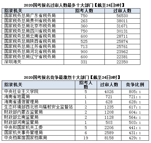 截止到24日9时,已有29个部门报名审核通过人数过万,广东省税务局过审人数56530人位居第一,还有一个过审人数超三万的部门是2019国考、2020国考报名期间都比较火热的国家税务总局贵州省税务局。