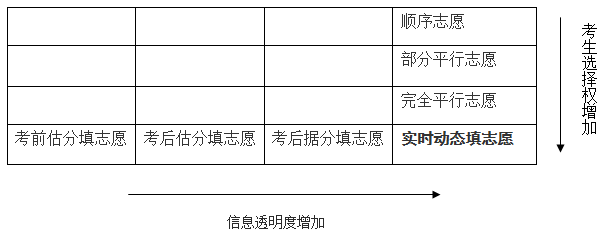 顺序志愿主要是指学生只能选择一所学校作为第一志愿、一所学校作为第二志愿、一所学校作为第三志愿。然后还有调配志愿。在这种规则下,学生必须选好第一志愿,如果第一志愿未被录取,由于学生心目中的好学校一般都会在第一志愿录取满额,那么第二志愿的学校的层次就会比较低,同样,第三志愿的学校层次会更低一些。部分平行志愿是指在第三或者第二志愿实行平行志愿。平行志愿的主要特点是分数优先,遵循志愿。即先将学生按分数排名,从第一名到最后一名逐次安排录取,到某一名的考生时,先看其平行的第一志愿学校,如果该学校录取满额,则看其平行第二志愿学校,依此类推。第三平行志愿是指学生在第三志愿选择时可以安排多个学校,第二平行志愿是指学生在第二志愿选择时可以安排多个学校。因为很多好学校都是在第一志愿上录取满额,所以第二、第三平行志愿虽然可以减少高分落榜的概率,但高分低就的现象仍然存在。而实行第一平行志愿后,高分低就的现象将大大减少。学生被录取到与其成绩相称的学校的概率大大提高。然而即使实行第一平行志愿,学生仍然是在信息不充分(决策时不知道还有哪些人选择了这一学校和专业,他们各自的成绩及其他竞争条件如何等)的情况下进行决策的。同时学生选择学校的多少(调整决策的次数也很有限)也有限制。因此,要达到志愿填报的理想状态,只有让学生决策时就知道现在已经报考此种专业、学校的人数及各自的成绩排名情况,该学校、专业的招生计划、调档比例等内容。同时,考生在某一时段内可以不限次数的调整其志愿决策。要做到这一点,从现在的经济技术条件来看,只须实行网上实时动态填志愿即可。即在网上将学校及专业的招生计划、调档比例、报考某学校、专业学生实时动态的信息(包括考生姓名、成绩、排名等)全部在网上实时披露出来。