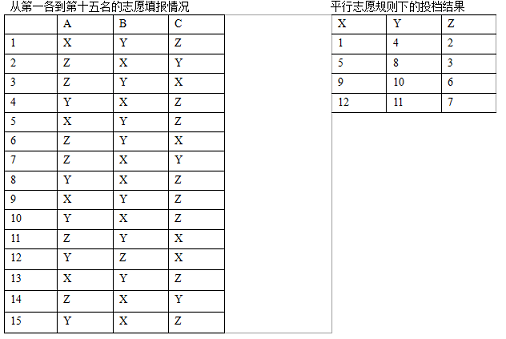现在,我们参照上表具体解析投档过程。假设共有15名考生(代号1-15)被划到第一批次,第一批次共有三所学校(X、Y、Z)参加录取,志愿表上学生只能填报此三校。并且X、Y、Z三所学校的招生计划都是3人,按调档比例算出要投入4人,那么根据平行志愿的规则,投档开始后,首先看排在第一名的1考生A志愿报的哪所学校,根据左表,1考生A志愿报的是X学校,这时,1考生的档案就被投送到X学校;然后再投第二名2考生,2考生A志愿报的是Z学校,那么2考生的档案被投到Z学校;同样再看第三名的3考生,第四名的4考生……,依此类推。但当投送到第11人时,新情况出现了,前10名考生都是投送到A志愿学校,而第十一名的11考生投档时,发现他所报的A志愿学校Z档案已经投满,这时就要看他的B志愿,他的B志愿学校为Y,这时,从表中发现Y学校尚有一个名额,于是就投送到Y学校;然后再看第十二名的12考生,他的A志愿Y学校、B志愿Z学校的档案都已经投满,这时就要看他的C志愿X学校,招办发现X学校尚有一名名额,于是,就将第十二名的12考生的档案投送到X学校。至此,第一轮投档结束。13-15号考生因为成绩低,只有等征集志愿后的第二轮投档。