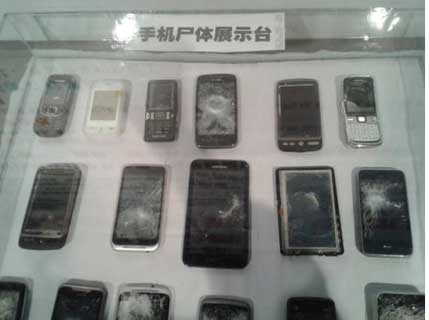 下午3时40分,记者赶到位于武昌黄鹂路上的该复读学校——武汉国华教育培训学校。一走进教学楼一楼大厅,记者看见靠墙摆放着一个棕色的桌子,玻璃罩下面整齐地放着17部手机,每部手机的显示屏均被砸坏,无法使用。被砸手机中包括苹果五代、HTC等价格较高的智能手机。而且,在展示台右方,还附有一封学校声明:“自学校颁布‘手机禁令’以来,大部分同学能自觉遵守,但仍有少数视校规为无物,屡教不改……既然手机挡住你看未来的视线,学校只好为了你的未来砸掉你的手机!……高考迫在眉睫,为了你的前途,你懂的!!!”