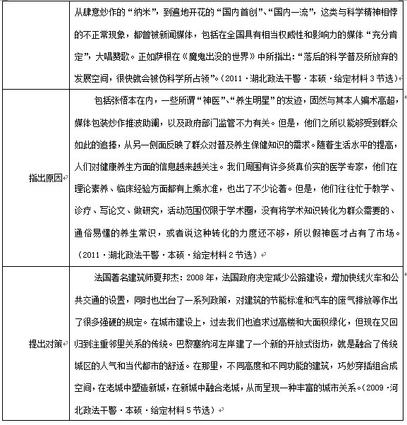 在对材料进行整体把握的同时,明确与题目相匹配的材料,具体细化为每一段、每一句,为要点的提炼提供依据。如2011湖北政法干警申论第一题,“根据材料1~3,请你分析张悟本事件折射出哪些现实问题。”首先要将目标锁定到“材料1~3”,找到“张悟本事件”的相关内容,对其有充分理解和把握,接下来再有针对性地结合“材料1~3”中阐释的事实,分析“张悟本事件”折射出的现实问题。