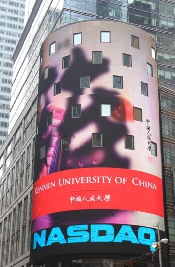 据记者了解,微博上“人大形象片走上纽约时报广场”的照片最初由人大校友刘晓川发布。照片显示,有十多层楼高的纳斯达克广告屏上,正在播放人大形象片,其中人大的代表色——朱红色以及中文和英文的校名清晰可见。整部形象片走中国风路线,主打水墨和油彩风格,以“厚、德、雅、博、是”五个书法汉字为主角,并在字中嵌入人大景观和Logo。这也是中国高校首次以这种方式向世界展示自己。