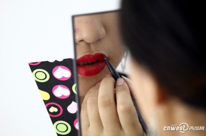 展台活动即将开始,李静凝开始补妆。
