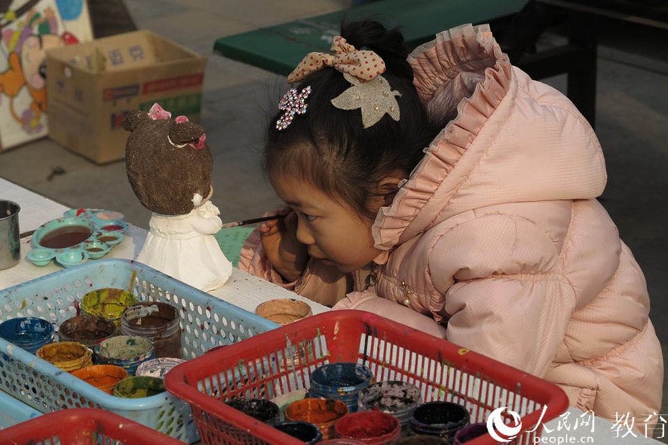 广场上,放了寒假的小朋友在认真的给陶瓷娃娃上颜色。