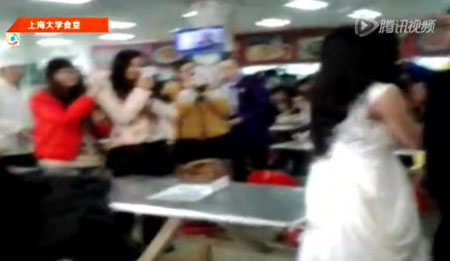 去年12月底,一则“上海大学穿婚纱女生在食堂拿着喇叭向一男生逼婚的视频”在网上引发网友围观。网友惊呼:“姑娘,你这么霸气,你家人知道吗?”但事后,上海大学影视学院《传媒新观察》官方微博辟谣称:“这只是某社团的特别活动,是在演戏。”