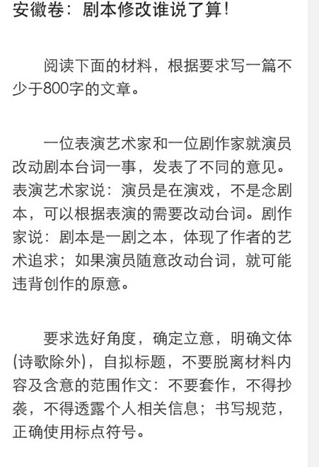 @银教授:今年的安徽高考作文题目:【演员拿到一个剧本,演员说要进行修改,但编剧说不能改,请根据这个内容写文章】。 这个出题人不愧是外行,竟然认为编剧有说话的资格。