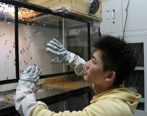 但如何让“尊贵矫情”的蜜蜂小姐开口喝水,却把杨珩难住了,他尝试把蜜蜂用老鼠贴粘在玻璃片上,把蜜蜂胡乱挥舞的手脚束缚起来,把蜜蜂放在一个小盒子里只开一个喝水的小孔等等,均以失败告终。就这样,杨珩从早晨尝试到傍晚,不吃不喝地逗蜜蜂喝水,手被蜜蜂蛰肿了,仍没有成功。挫败感并没有打败杨珩,最后的坚持让他幸运地遇到了一只给力的蜜蜂,它疯狂地喝水,使杨珩从各个角度清晰地观察了“蜜蜂喝水”的一举一动,拍摄到了珍贵的视频资料。“这个实验完成后,我们欣喜若狂,把蜜蜂都放生了,尽情地让蜜蜂蛰我们!也许,热爱自然,坚持信念的人,老天也会给我们好运吧!”直到现在,我们仍能感到杨珩成功的喜悦。