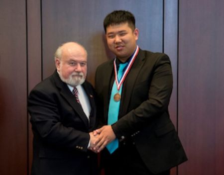 特洛伊高中华裔生包容(右)入选美国生物奥林匹克训练营接受表彰。