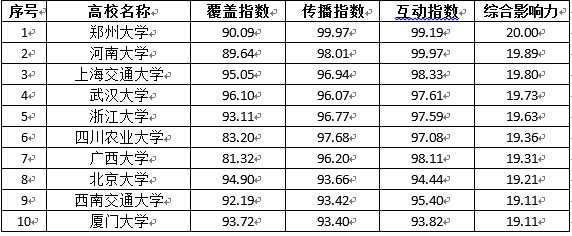 其中,高校新媒体影响力是通过对高校“双微”(校本级官方认证账号,不包括下属院系及团体账号)覆盖指数、传播指数和互动指数等指标进行赋权分析,综合评估高校“双微”等新媒体的综合影响力。郑州大学、河南大学、上海交通大学、武汉大学、浙江大学、四川农业大学、北京大学、广西大学、西南交通大学和厦门大学位居全国高校前十位。