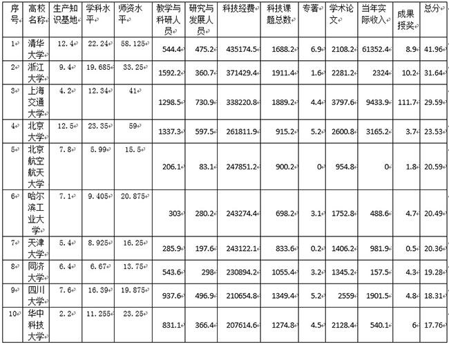 清华大学、浙江大学、上海交通大学、北京大学、北京航空航天大学、哈尔滨工业大学、天津大学、同济大学、四川大学、华中科技大学位居全国高校科研影响力前十,反映出工科院校、综合类高校科研实力远超文科类院校。