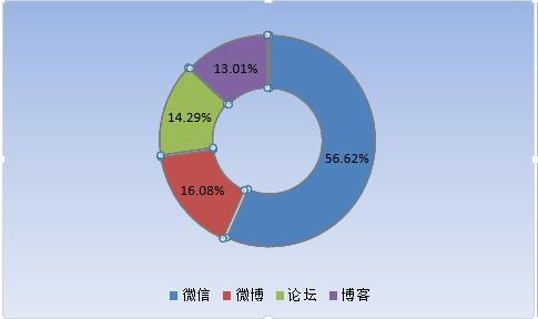 2015-2016年度,全国126所高校网络舆论关注度总量中,微信关注度最高,占比56.62%;微博次之,占比16.08%;论坛、博客占比最低,分别为14.29%、13.01%。双微平台对于高校关注的总量占到全部份额的八成多,说明微博、微信等新兴社交媒介在现阶段影响力较大,论坛、博客等传统社交平台渐已式微。