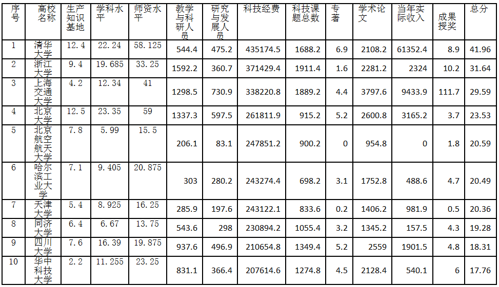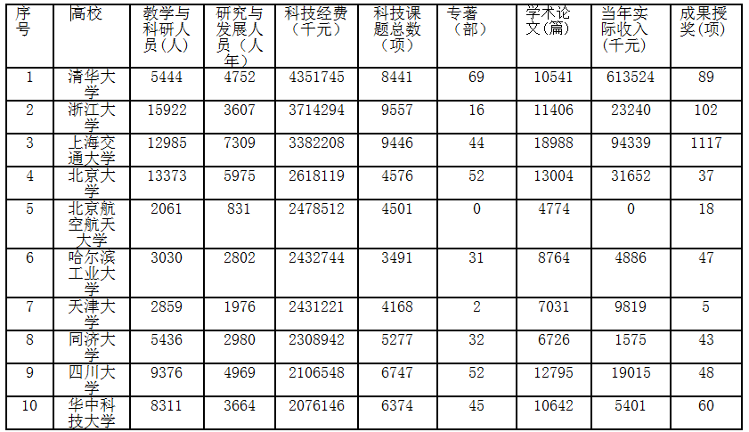 从上表可以观察到清华大学在多项指标中位居首位,如科技经费、科技成果专著、论文、技术转让方面的当年实际收入等。多项核心指标反映了清华大学在科研影响力方面雄踞全国高校之首的强大实力。