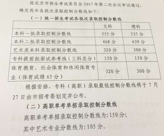 2017年北京高考分数线出炉 一本文科555分理科537分