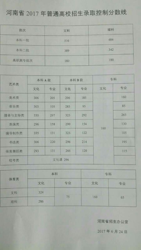 好博体育郑州6月24日电 (侯琳琳)6月24日下午,记者从河南省招生办公室获悉,河南省2017年普通高校招生录取控制分数线公布,本科一批录取控制分数线:文科516分,理科 484分;本科二批录取控制分数线:文科389分,理科342分。今年本科二批与三批合并录取。专科录取控制分数线:文理科均为180分。