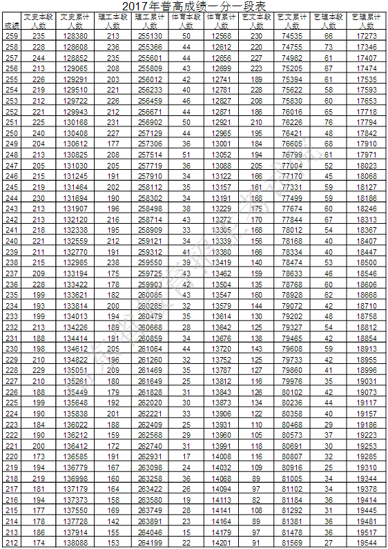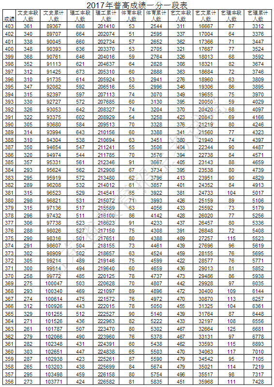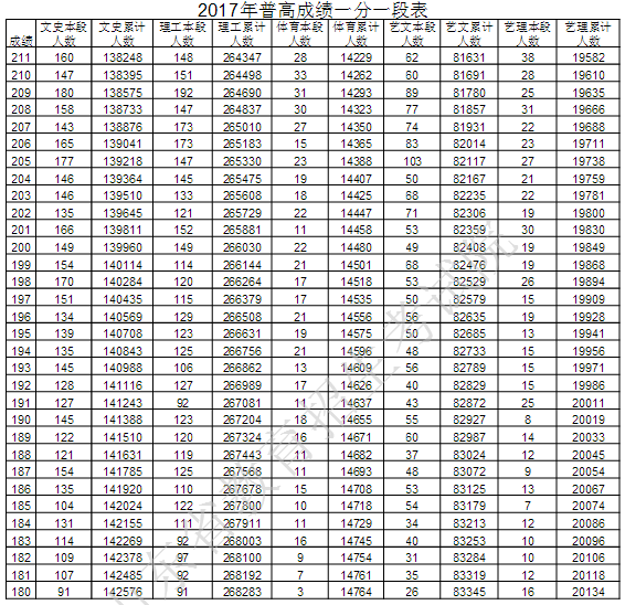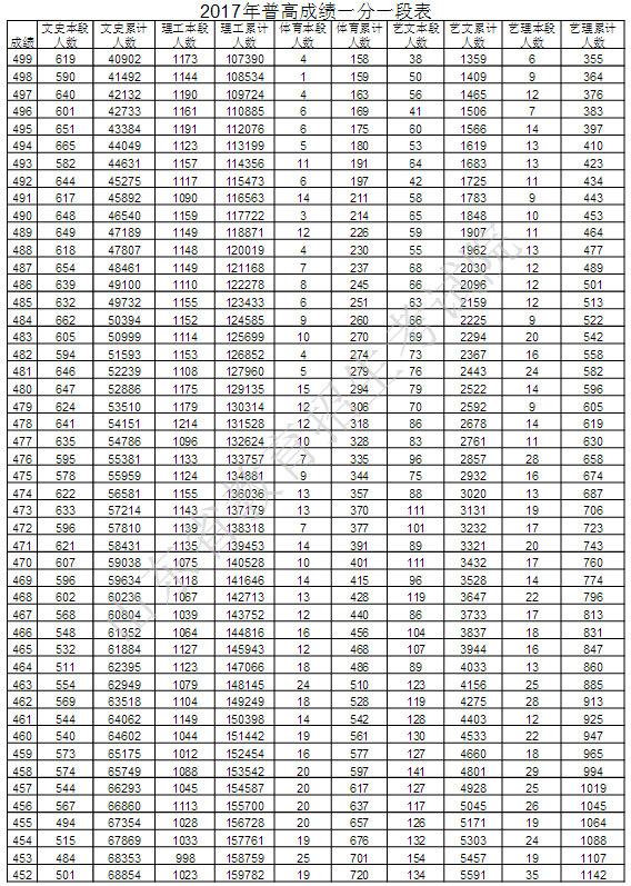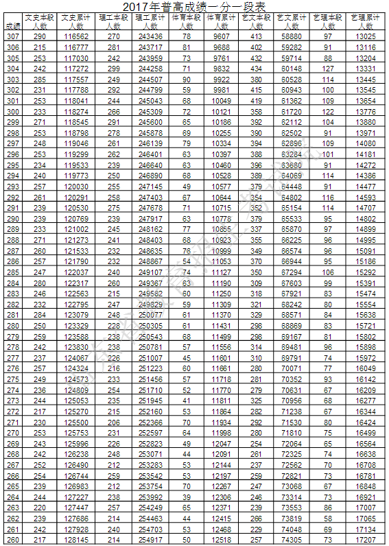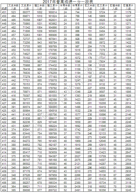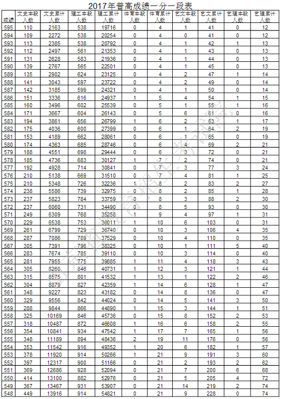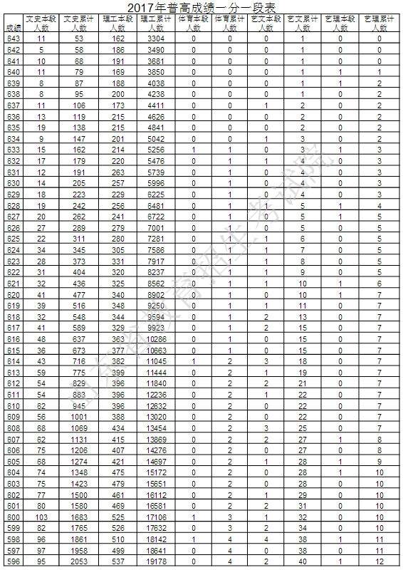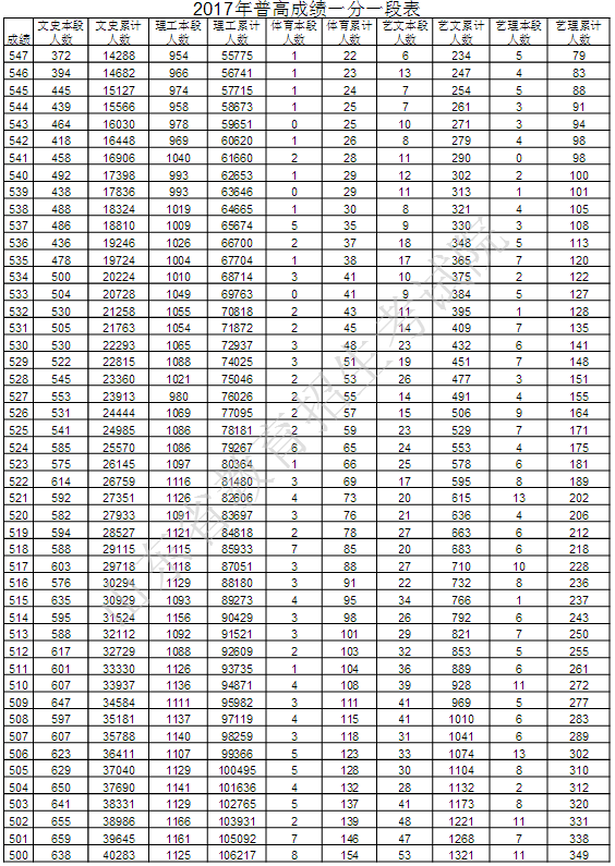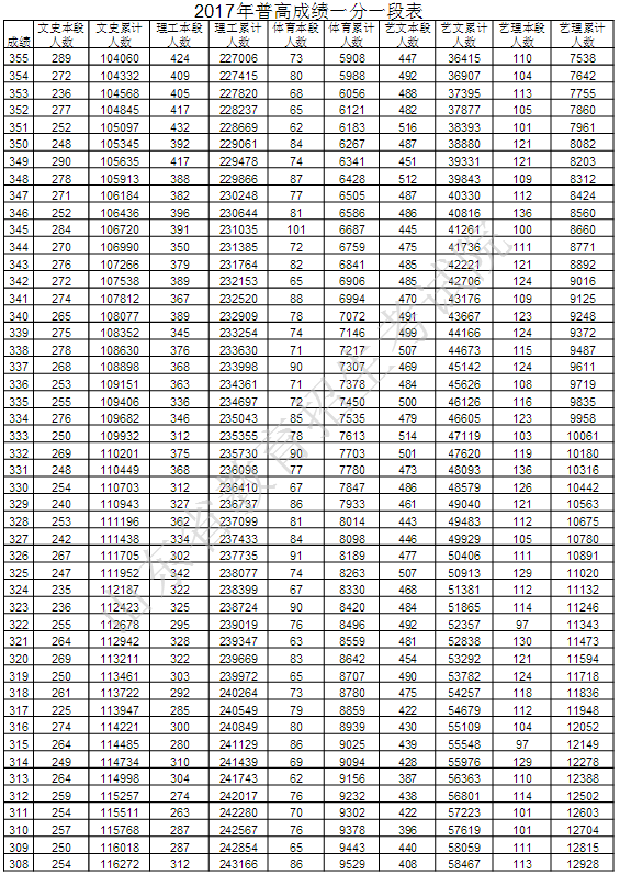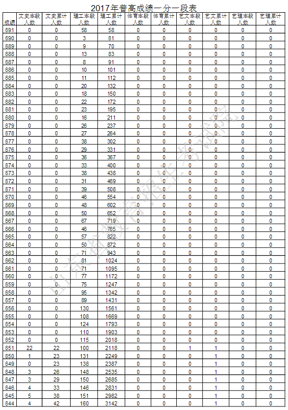 山东教育考试院最新公布2017年普通高考成绩分段统计表,详细如下: