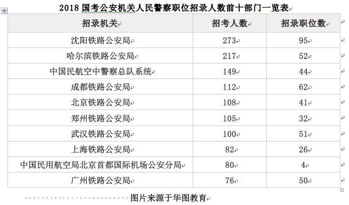 从整个招生的单位来看,全国共有55个部门参与招录工作,铁路公安局、海关、出入境检查边防总站等为招录最多的岗位。每年铁路公安局都是招录人民警察最多的单位,哈尔滨和沈阳铁路公安局招录的人数最多。