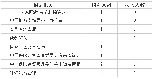 目前,国家能源局华北监管局、中国地方志指导小组办公室两个部门仍处于虚位以待的状态,符合条件的考生可以重点考虑,以下几个部门报考都相对“冷清”,考生们可在职位表里查看相关条件信息,看是否能够报名。