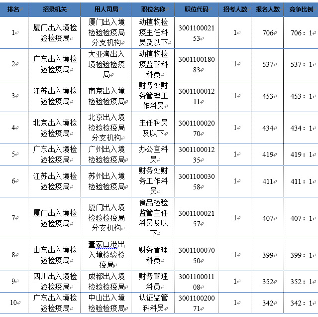 最受考生欢迎的出入境相关岗位,绝大多数都位于江浙闽粤京鲁等发达地区,虽然已经表现出很大的竞争趋势,但报名人数一涨再涨。截止到11月5日16:00,厦门出入境检验检疫局分支机构动植物检疫主任科员及以下岗位持续领跑,成为出入境各部门报名人数最多、竞争比例最高“双高”职位,竞争比例攀升至达706:1。大亚湾出入境检验检疫局动植物检疫监管科科员岗位紧跟其后,竞争比例达到537:1。竞争比超过400:1的岗位已经达到了7个。具体数据可参见表1。