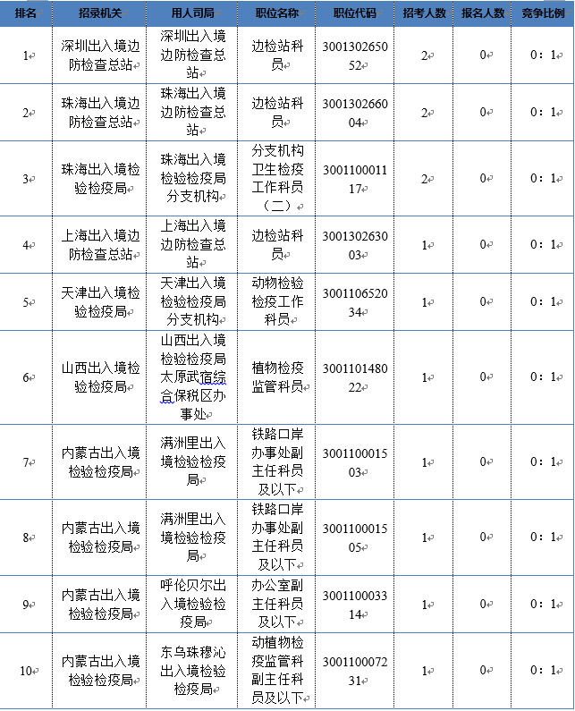 表1 2018年国考出入境各部门竞争最激烈的十大职位(数据截至11月5日16:00)