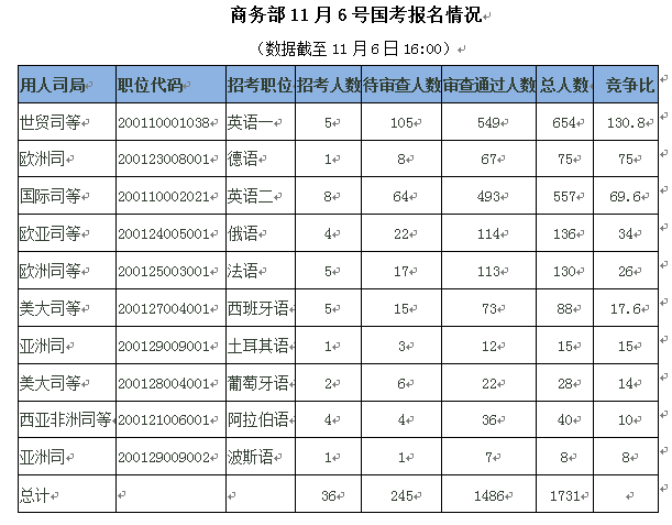 好博体育北京11月7日电 (张歌)昨日是国考报名第八天,商务部报名开始步入高峰期,截至11月6日下午四点,商务部共有1731人报名,1486人通过审核,245人等待审核中。商务部今天的竞争最激烈的岗位依然是世贸司等的英语一(职位代码200110001038),最高竞争比达130.8:1。