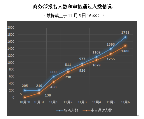再来观察下昨日的商务部报名人数和审核人数的增长情况,通过下图我们可以发现其斜率明显变大,这也证实了国考高峰期的到来,很多考生都会在这几天下定决心,好博体育教育频道建议还未报考的考生不要慌乱,结合自身情况理智选择适合自己的岗位。