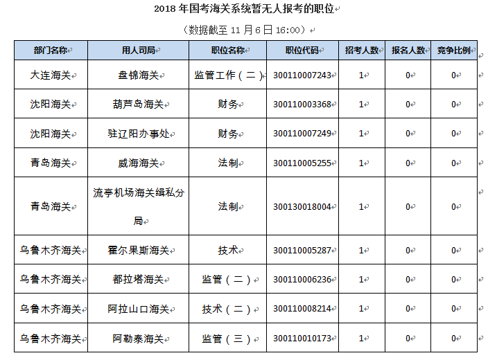 我们汇总整理了暂时无人报考的职位相关信息,共有27个职位暂时无人通过审核,9个职位无人报考,其中无人报考的职位如下表,尚未报名的考生可关注下这些职位。