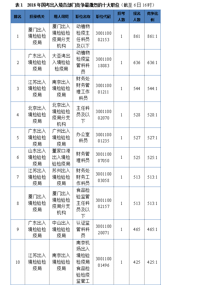 由表1可以看出,出入境各部门热门职位竞争比例最激烈的前五个部门与昨天一致,且竞争更为激烈,其中厦门出入境检验检疫局分支机构动植物检疫主任科员及以下岗位依旧是出入境各部门报名人数最多、竞争比例最高“双高”职位,竞争比例已经攀升至861:1。大亚湾出入境检验检疫局动植物检疫监管科科员岗位紧跟其后,竞争比例达到537:1。截止到目前,出入境各部门竞争比超过500:1的岗位已经达到了8个。