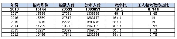 再次从无人报考职位来看,共有119个职位无人报考,占0.74%,比去年降低了一半。而从近7年的数据来看,除了2012年为0.7%,其余年份都比今年高,也可以看出考生报名更加向着均衡化发展。