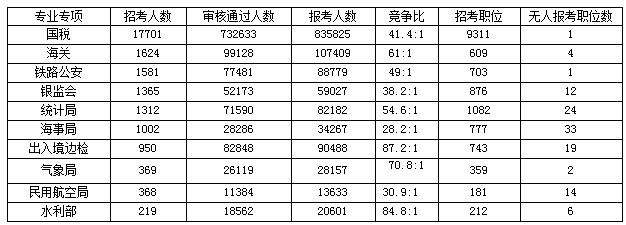 国税是招录大户,共有73万人通过审核,仍有10万人待审中,无人报考职位仅剩1个。海关审核通过人数位居第二,有9.9万人通过审核,竞争比为61:1。水利部竞争比最高,为85:1。国税、海关、铁路公安、银监会、统计局、海事局、出入境边检、气象局、民航、水利部是国考招录大户,也是考生报考的重点,竞争压力都不小