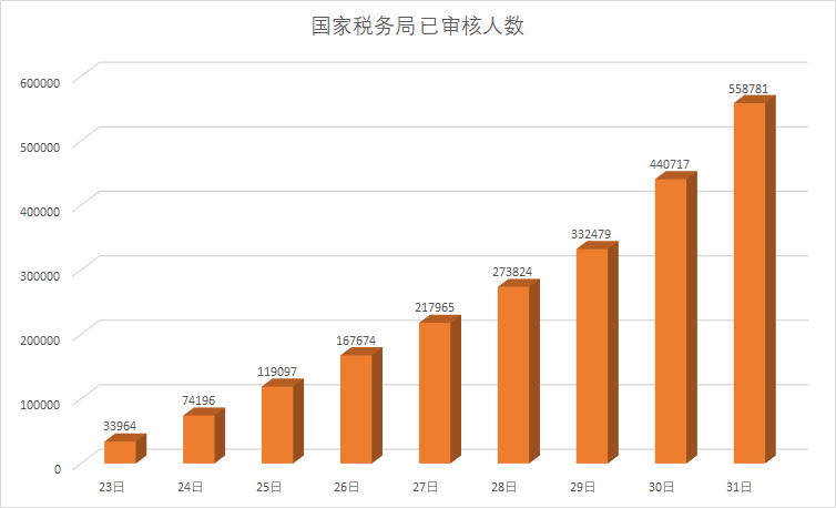 通过上图可以看到,从报名一开始,每天的报名人数都在直线上升,而且从29号开始,每天近10万的增长。截止31日18:00,虽然报名停止了,但审核还没结束,在11月2日以前,国税的过审人数,竞争情况还会有可能变化,不管怎样,这都将是国税“最难一年”。