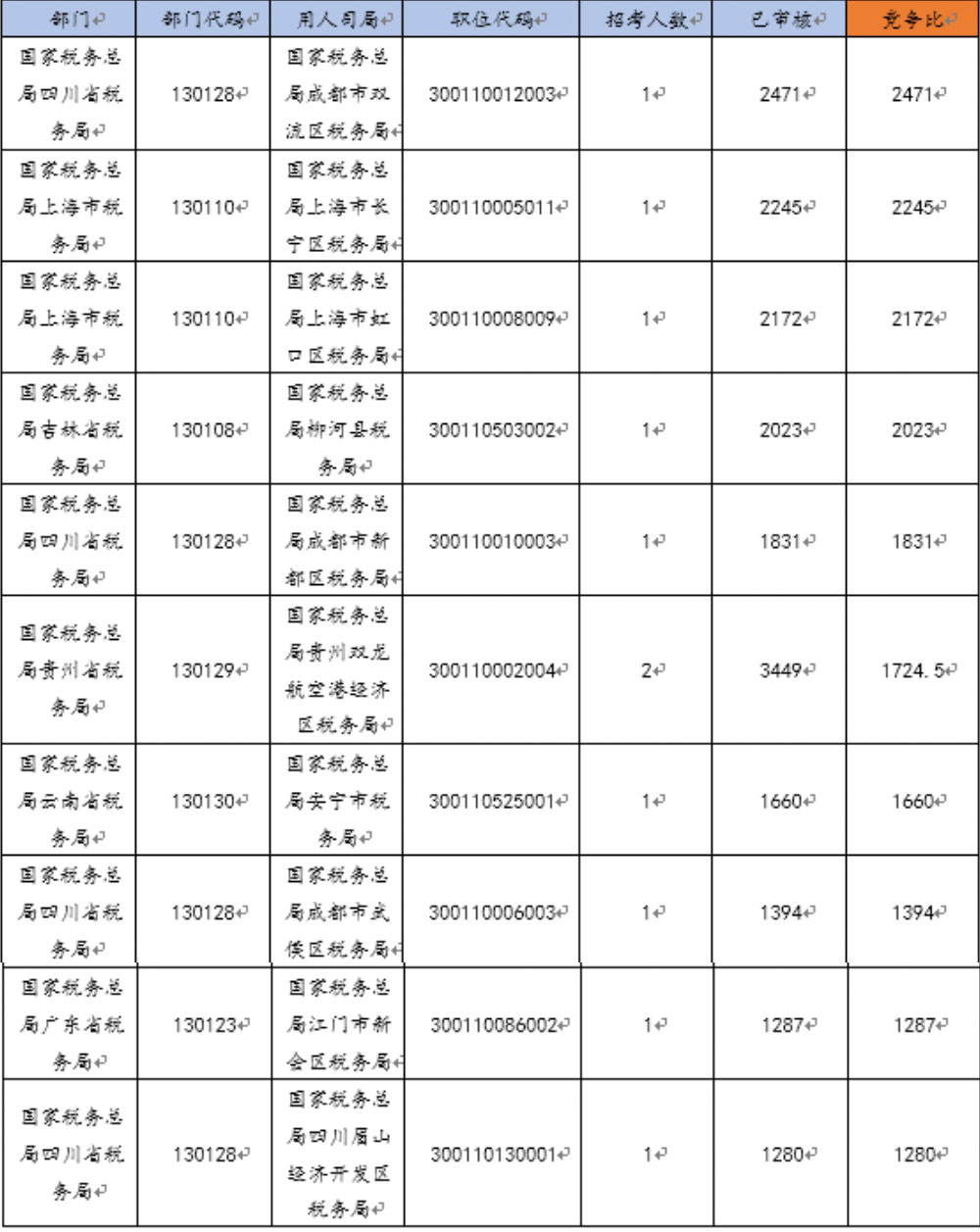 国税系统竞争最大的前10大岗位(截止31日18:00前)(图片来源:华图教育)