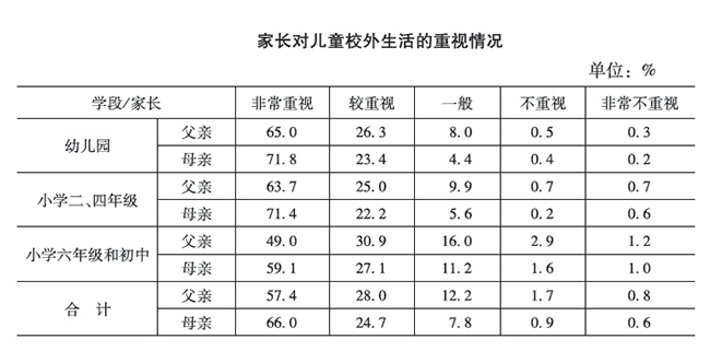 对于儿童的校外生活,85%以上的家长表示“很重视”,60%的家长、59.3%的儿童对目前的校外生活表示“很满意”或“比较满意”。90%以上的家长认为校外生活对孩子的成长很有价值。95%以上的家长、89.5%的儿童认为校外生活有效提高了儿童人际沟通交流方面的能力。