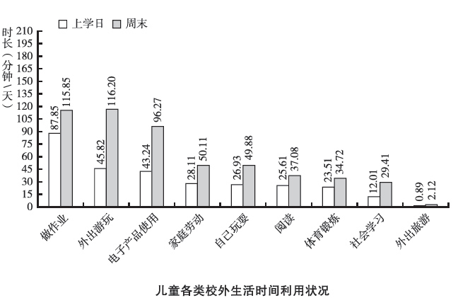 报告显示,在上学日,平均每个儿童的校外生活时间分配中,花费时间最多的类别是做作业(包括学校作业、课外班作业、家长布置的作业、其它作业),占时87.85分钟。在周末,占据儿童校外生活时间最多的事项是外出游玩,占时116.20分钟。在假期,78.70%的儿童有暑假走亲访友的经历,62%的儿童有外出旅游的经历。