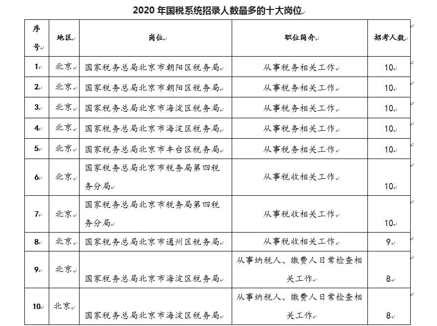 今年国税各职位招录人数都有所下降,国考大部分职位招录1-3人,所以能够达到8人以上的岗位就可以跻身国税系统招录人数前十大岗位了,而且这些岗位里面都为北京地区独占。除此之外,国家税务总局北京市丰台区税务局、国家税务总局北京经济技术开发区税务局、国家税务总局北京经济技术开发区税务局、国家税务总局北京市税务局第四税务分局相关岗位招考人数也为8人。