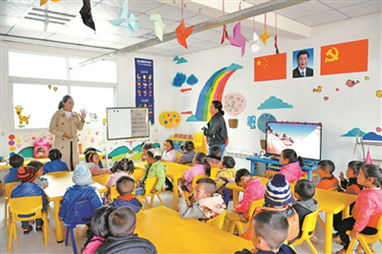 而这样的情况,在当地却是普遍现象。两位辅导员坚持按“一日活动流程”“每周一计划”“每月一主题”安排,从最简单的发音、日常生活用语和对话入手,通过一年的普通话学习,现在孩子们都能用普通话讲故事唱儿歌。