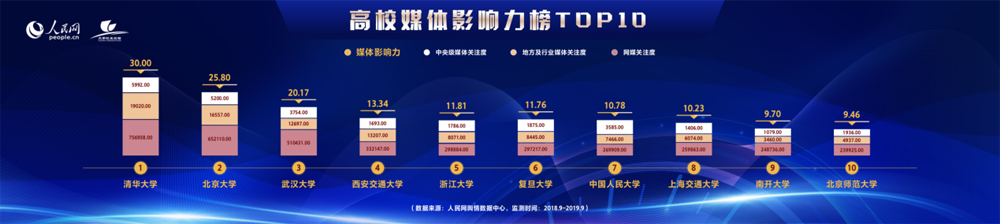 第二个榜单是高校媒体影响力榜单。清华大学、北京大学、武汉大学、西安交通大学、浙江大学、复旦大学、中国人民大学、上海交通大学、南开大学、北京师范大学位居榜单前十。在中央主要新闻网站方面,好博体育对各高校的报道量位居第一,有52093篇。如好博体育发布《高校师生热议习近平总书记在学校思政课教师座谈会重要讲话》《教育部10所高校组团支援西藏大学发展》《大学校长论坛:为“双一流”建设注入新活力》等多篇报道被各大门户网站竞相转载。
