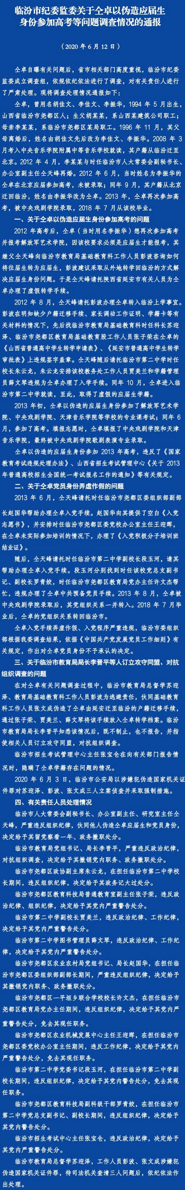 好博体育北京6月12日电 (记者 郝孟佳)今天,山西省纪委监委网站发布了关于仝卓以伪造应届生身份参加高考等问题调查情况的通报,其继父仝天峰因伪造仝卓应届生和党员身份,被给予留党察看一年、政务撤职处分。临汾市教育局党组书记、局长李晋平对抗组织调查,被撤销党政职务。此外,临汾市教育局总督学苏迎泽,工作人员彭波、张文成涉嫌犯伪造国家机关证件罪,待司法机关查清三人问题后,依纪依法作出处理。