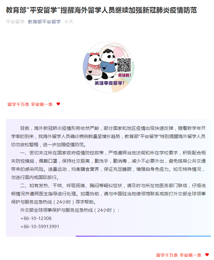 好博体育北京9月28日电 (记者 郝孟佳)今天,教育部留学服务中心通过微信公众号“平安留学”提醒海外留学人员继续加强新冠肺炎疫情防范。