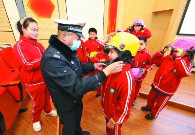 12月2日是“全国交通安全日”,多所学校、幼儿园纷纷举行形式多样的安全教育活动。图为河北省石家庄市,交管局新华交警大队的民警为中华大街小学学生们演示如何正确佩戴头盔。新华社发