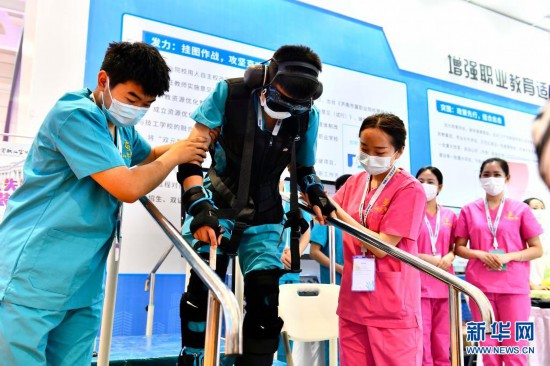 5月20日,在山东国际会展中心,山东圣翰财贸职业学院学生通过智能设备体验失能老人生活。