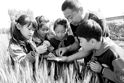 2021年5月21日,山东省高密市豪迈小学师生来到麦田“写作业”,他们在农民伯伯的指导下零距离观察小麦,学习“小满”节气的农耕常识。光明图片
